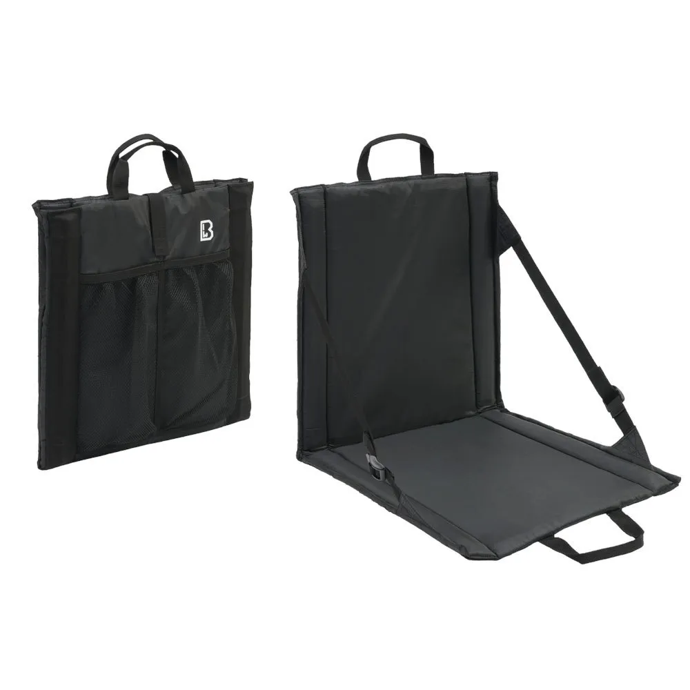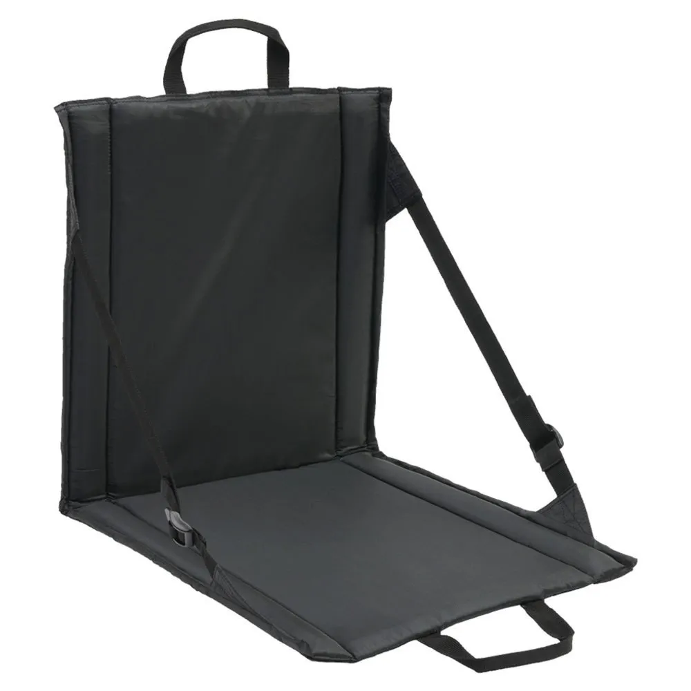 carrying and folding seat with backrest, ideal for camping, festivals, hiking, beach vacations or in daily life, two-part net bag for water bottles and other equipment, stable carrying handles, velcro fastener, soft, comfortable seat and backrest, backrest adjustable in angle, robust polyester material, easy to clean.